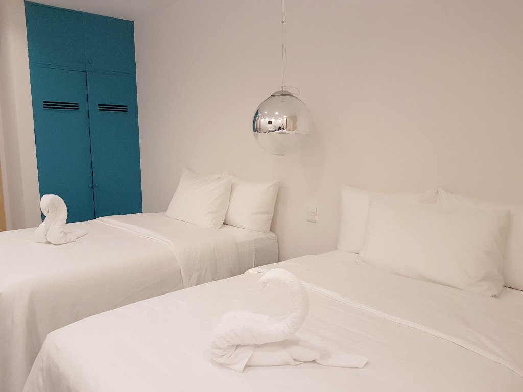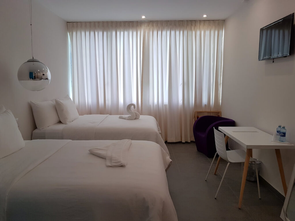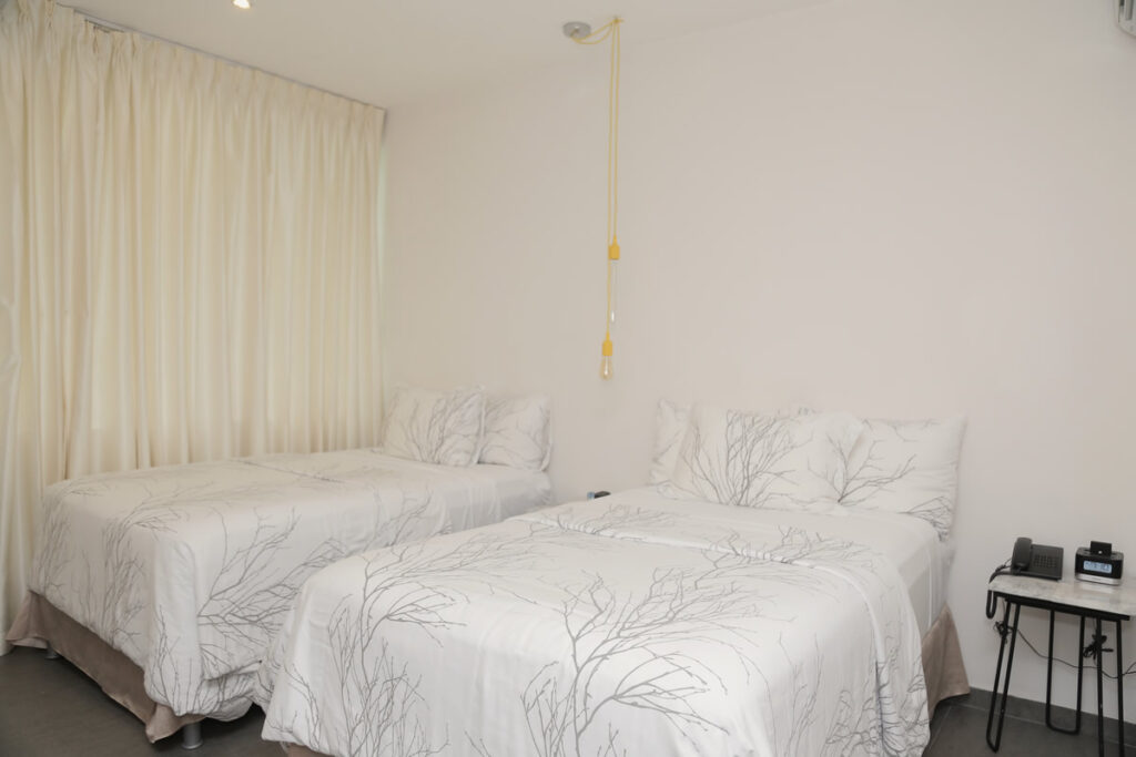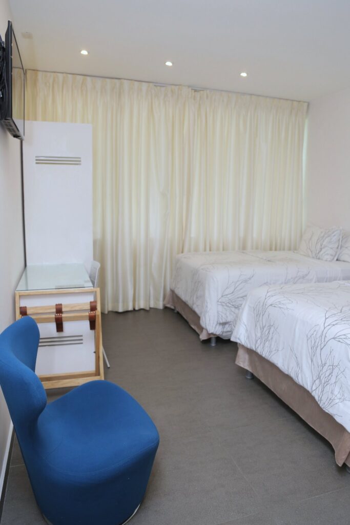 Habitacion Doble Habitación para 2 personas, equipada con dos camas individuales (1.20 x 1.90 mts), baño privado, agua caliente, escritorio de trabajo, secador de cabello, clóset, teléfono, cable TV, pantalla LCD de 32 pulgadas, aire acondicionado y conexión WIFI.